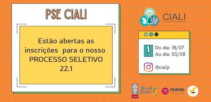 CiAli, empresa júnior do curso de Ciência e Tecnologia de Alimentos (CTA), está com processo seletivo aberto.As inscrições vão até 5 de agosto.