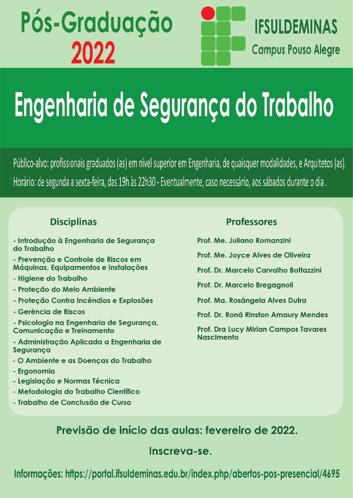 A modalidade será presencial e oferecida no campus Pouso Alegre. Inscrições até o dia 31/10/2021.
