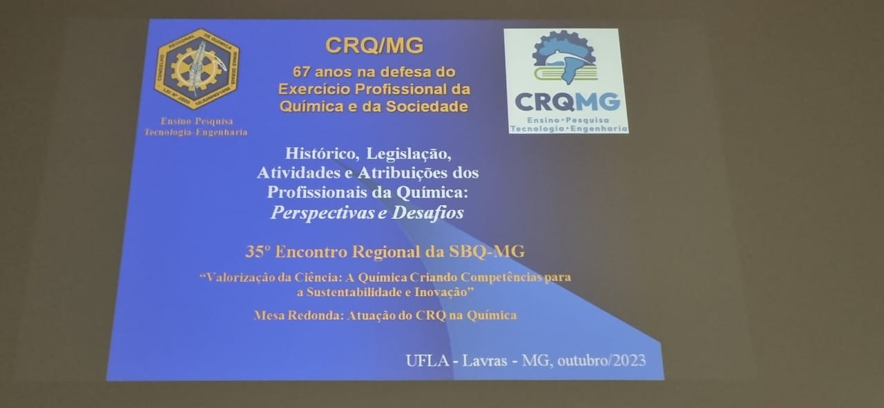 O 35º Encontro Regional da Sociedade Brasileira de Química de Minas Gerais (35ERSBQ), que ocorreu de 20 a 22 de outubro de 2023, teve como foco a "Valorização da Ciência: A Química Criando Competências para a Sustentabilidade e Inovação". Este evento anual foi organizado/ coordenado pela Prof. Dra. Maria das Graças Cardoso e a equipe da UFLA, está presente no estado desde 1987, foi sediado na Universidade Federal de Lavras. Ao longo de três dias, o 35ERSBQ proporcionou aos participantes uma ampla gama de tópicos relevantes nas áreas de Ensino de Química, Físico-Química, Química Orgânica, Química Inorgânica e Química Analítica. Esses temas foram discutidos em sessões plenárias, minicursos e mesas redondas, liderados por pesquisadores de destaque nacional. Além disso, a comunidade científica e industrial de Minas Gerais apresentou seus trabalhos nas esferas de ensino, pesquisa e extensão, por meio de sessões coordenadas, painéis e outras atividades, dirigidos a um público qualificado. O presidente do CRQMG, Prof. Dr. Wagner José Pederzoli, o coordenador de fiscalização e conselheiro federal Rodrigo Alan de Moura Rodrigues, e a conselheira do CRQMG Profa. Dra. Hállen Daniel Rezende Calado participaram ativamente desses eventos.