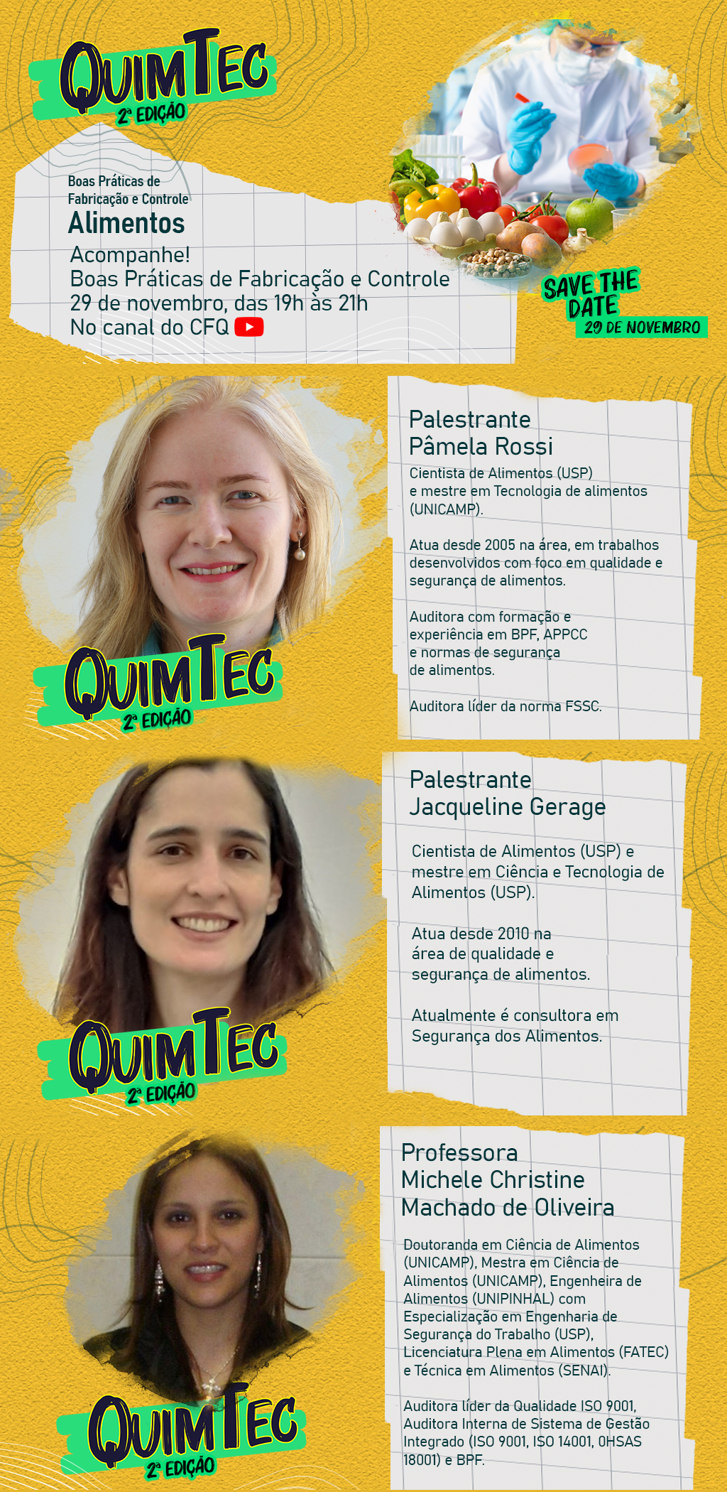 Boas Práticas de Fabricação e Controle de Alimentos. 29 de novembro, das 19h às 21h. No canal do CFQ no YouTube.